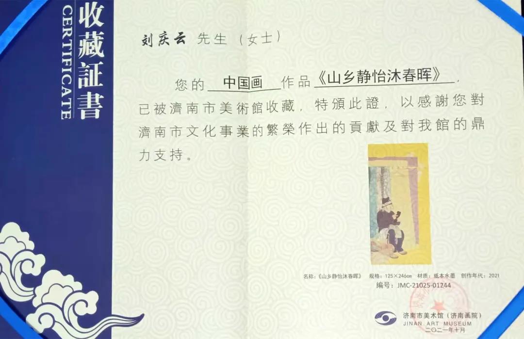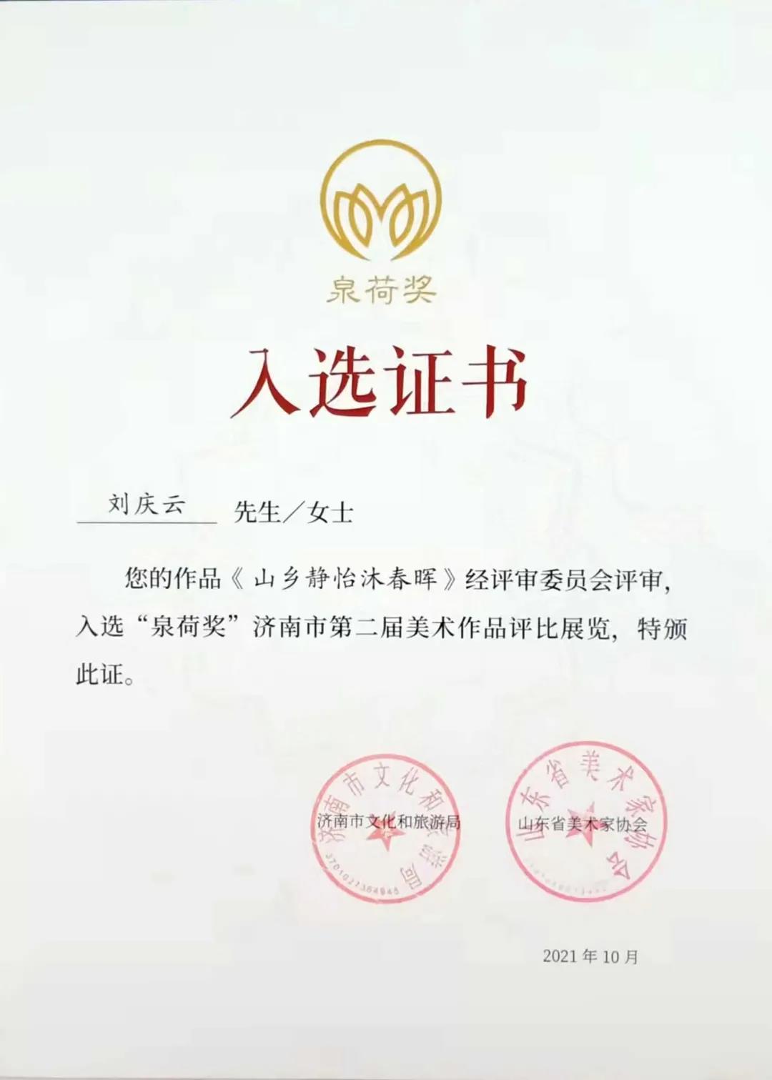 2021年10月《山乡静怡沐春晖》入展第二届“泉荷奖”,作品被济南美术馆收藏。