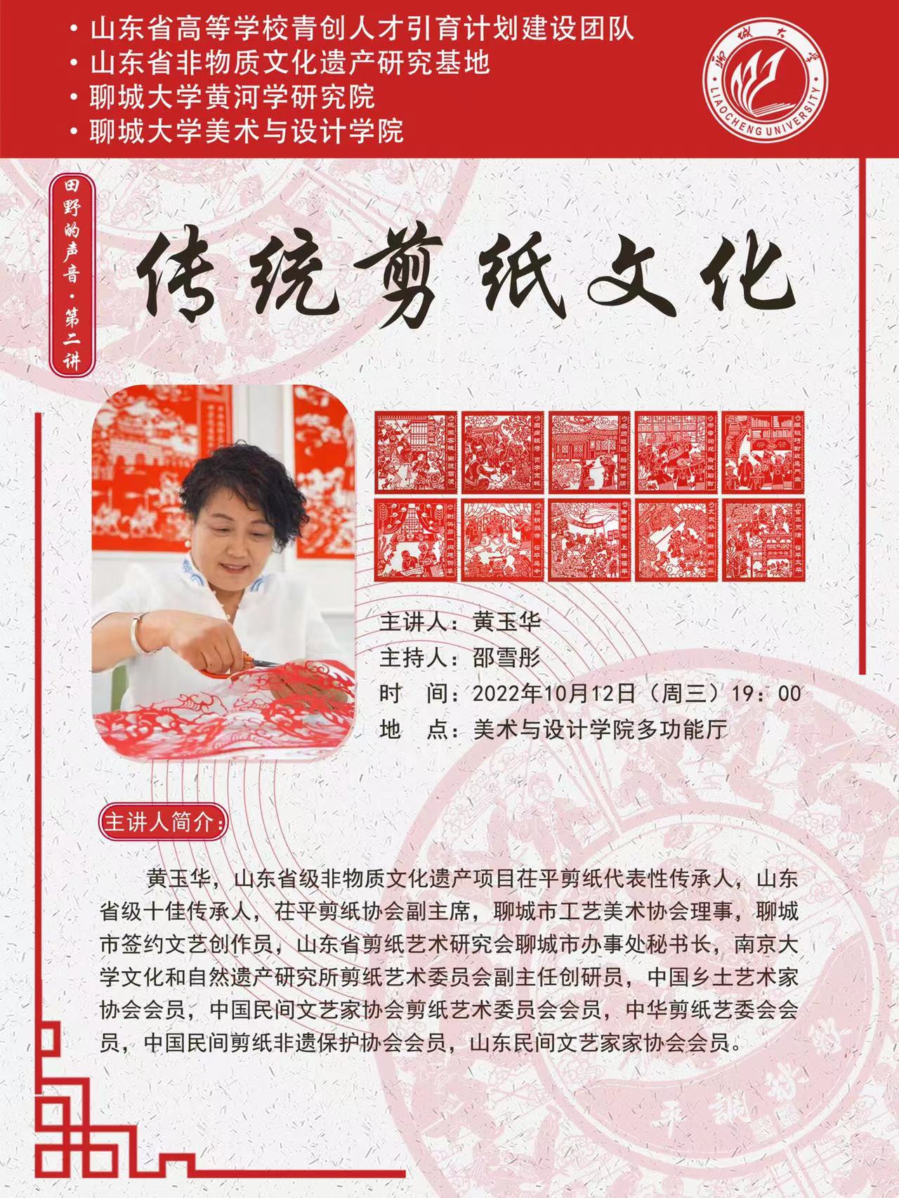 传承人是非物质文化遗产保护的核心。10月12日,在7号楼多功能厅, 跳蛋 邀请了茌平剪纸传承人黄玉华老师为同学们作了题为《传统剪纸文化》的讲座。