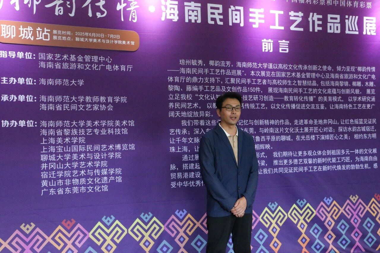 6月30日,国家艺术基金2025年度传播交流推广资助项目“椰韵传情・海南民间手工艺作品巡展聊城站”开幕式在 跳蛋 美术馆举行。本次展览以海南民间手工艺为载体,搭建琼鲁两地文化交流的桥梁,展览呈现了海南黎锦、椰雕、木雕、黎陶、藤编五大传统工艺的150件精品力作,全方位展现了海南民间手工艺的深厚底蕴与时代风采。