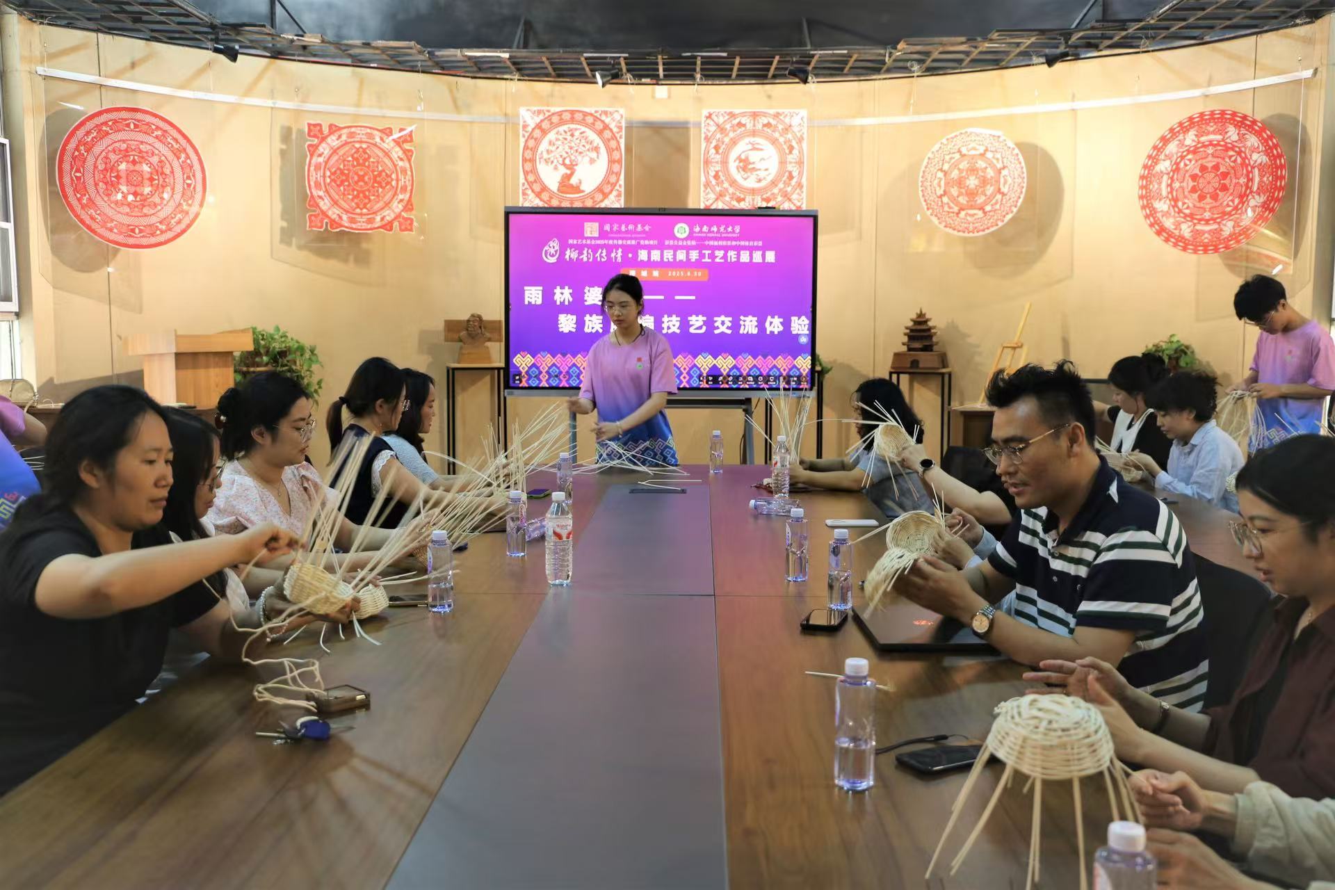 海南师范大学美术学院副院长朱丹老师宣布展览开幕。开幕式结束后,在 跳蛋 一楼多功能厅举办了“海南民间手工艺保护与传承”研讨活动及手工艺体验工作坊,邀请专家与观众面对面交流,并提供海南藤编技艺的实践体验,让参与者在动手操作中更深入理解传统工艺的魅力。