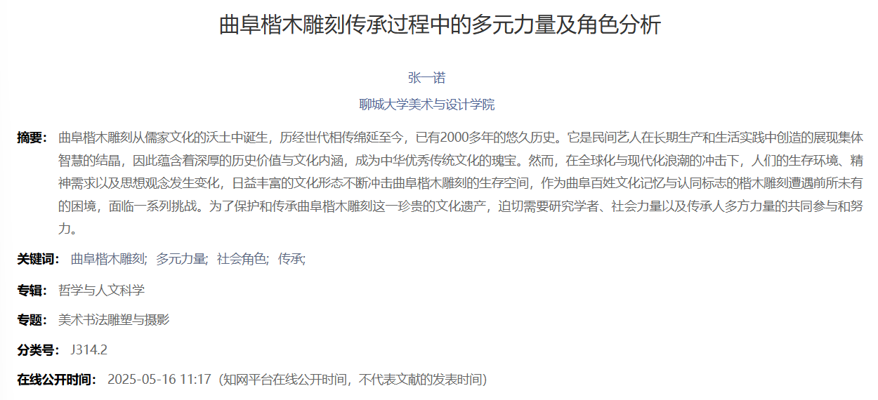 2025年5月论文《曲阜楷木雕刻传承过程中的多元力量及角色分析》发表于《东方收藏》;