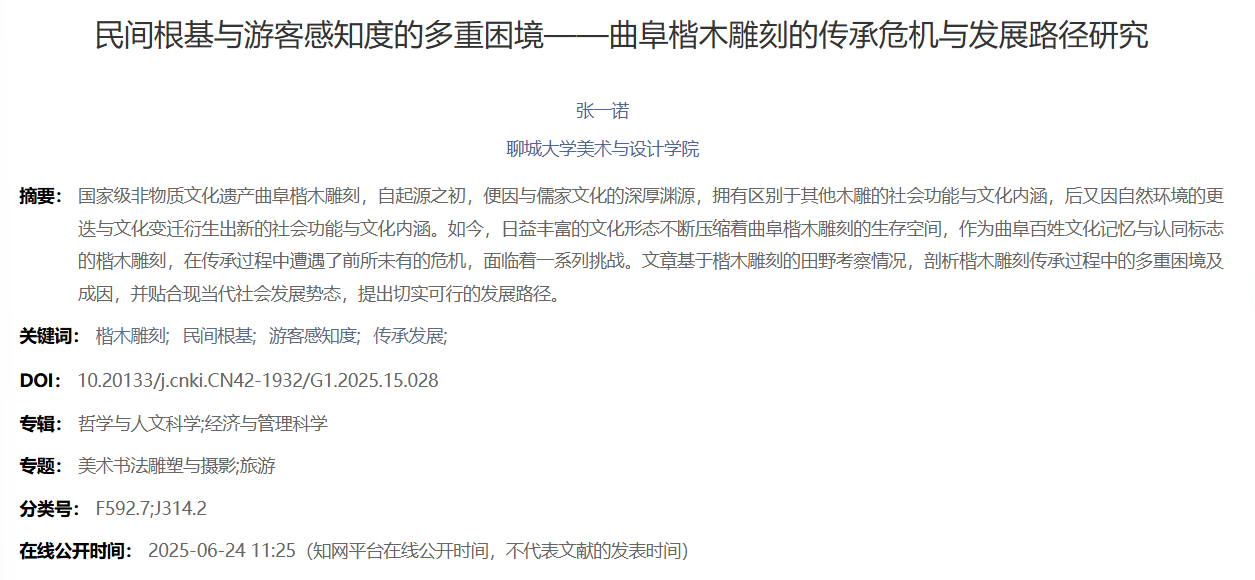 2025年6月论文《民间根基与游客感知度的多重困境——曲阜楷木雕刻的传承危机与发展路径研究》发表于《新楚文化》;